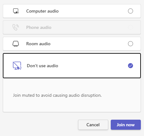 Instead of using the default Computer audio, select the bottom option, Don't use audio. From there, just click Join now.