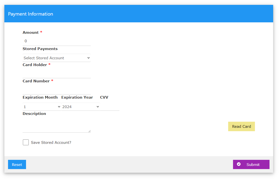 The Read Card button is used if you are swiping the card. For the purpose of this process we recommend manual entry.
